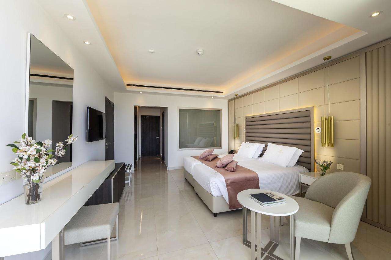 Szobák: minden szoba elegáns és modern berendezéssel, világos színvilággal, egy hálószobás (~33 m2) légkondicionált, fürdőszobás, hajszárítóval, síkképernyős tv-vel, minibárral, vízforralóval (tea és kávéfőzési lehetőség), telefonnal és széffel felszerelt. A családi szobák hasonlóan berendezettek, alapterületük nagyobb (~40 m2), kényelmes elhelyezést biztosítanak 2 felnőtt és 2 gyerek számára (emeletes ágyon). A szobákhoz erkély tartozik szárazföldre, oldal tengerre , tengerre néző vagy front tengerre néző kilátással.