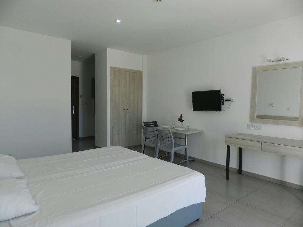 Szuperior stúdiók (~25 m²): praktikusan berendezett, fürdőszobás szobák konyhasarokkal (főzőlap, hűtő, vízforraló, kenyérpirító, edények, evőeszközök), Tv-vel, hajszárítóval, szobaszéffel és légkondicionálóval felszerelt, valamint utcai vagy medencére néző erkéllyel rendelkezik.