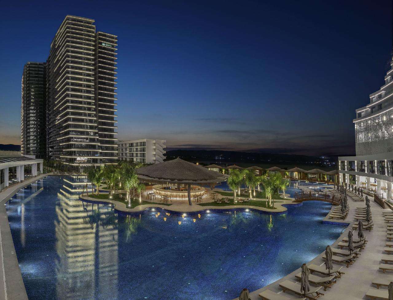 Fekvése: a 2023-ban megnyitott, ikonikus épületegyüttes több különálló toronyból és egy hatalmas, trópusi hangulatú medencekomplexumból áll, amelyet Észak-Ciprus „legnagyobb medencéjeként” tartanak számon. A szálloda grandiózus méreteivel, modern dizájnjával és kiváló szolgáltatásaival a régió egyik új luxusreferenciájává vált. A szálloda kb 500 méterre található a széles, homokos tengerparttól, ahol a hotel a vendégek számára privát partszakasszal, napernyőkkel és napágyakkal biztosít kényelmes pihenést. A partszakaszra folyamatos ingyenes shuttlejárat közlekedik (privát szervizúton). A Grand Sapphire Resort négy fő toronyépületben és több kisebb szárnyban(resort) kínál szobákat, összesen több mint 1200 luxuskategóriás lakóegységgel. A környék az elmúlt években az egyik legdinamikusabban fejlődő üdülőterületté vált Észak-Cipruson – új éttermekkel, bárokkal, üzletekkel és promenáddal. Famagusta központja kb. 15–18 km, míg a Larnaca nemzetközi repülőtér kb. 65–70 km távolságra helyezkedik el. A transzferidő a határátkeléstől függően kb. 90 perc. A szálloda tökéletes választás azok számára, akik egy ultramodern, új építésű luxusresortban szeretnének pihenni, kiváló létesítményekkel, hatalmas medenceparkkal, széles gasztronómiai kínálattal, saját kaszinóval és családbarát szolgáltatásokkal. Stílusa a mediterrán-török vendéglátást ötvözi a modern városi hotelérzéssel – így családok, párok és premium utazók egyaránt megtalálják számításaikat.
