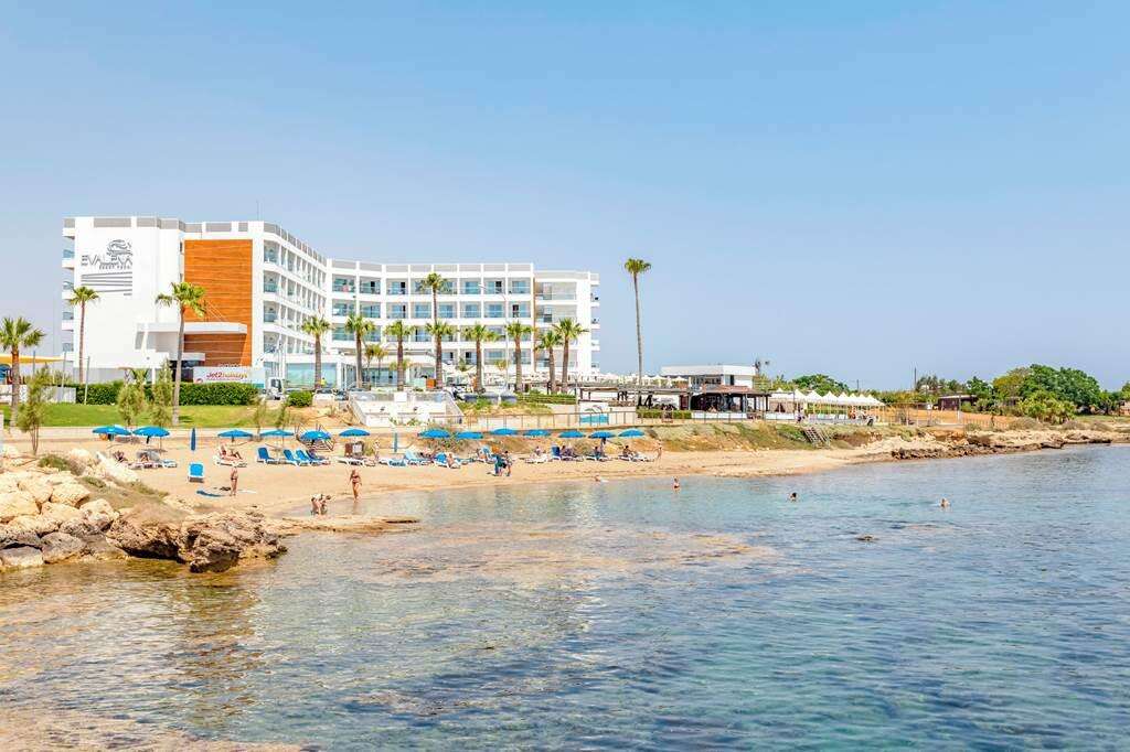 Fekvése: Protaras üdülőhelyen a híres Fig Tree Bay és a Pernera Beach között, közvetlenül a tengerparton épült, modern, 179 szobás szálloda, az üdülőváros leghosszabb egybefüggő homokos strandjának kiindulópontján található. Az Evalena Beach Hotel, amely a modern, letisztult dizájn és a ciprusi vendégszeretet tökéletes harmóniáját kínálja mindössze pár perc sétára található a város nyüzsgő központjától, ahol éttermek, bárok és üzletek várják a látogatókat. A szálloda közelében található buszmegállóból tömegközlekedéssel a környező üdülőhelyek (Ayia Napa) könnyedén és gyorsan elérhetők. A szálloda tökéletes választás minden korosztálynak, akik szeretnék élvezni Protaras nyüzsgését, de mégis egy elegáns, modern, tengerparti hotel kényelmét keresik. A hotel jó ár-érték arányával, modern megjelenésével és kiemelkedően előnyös fekvésével Protaras egyik legkedveltebb választása.