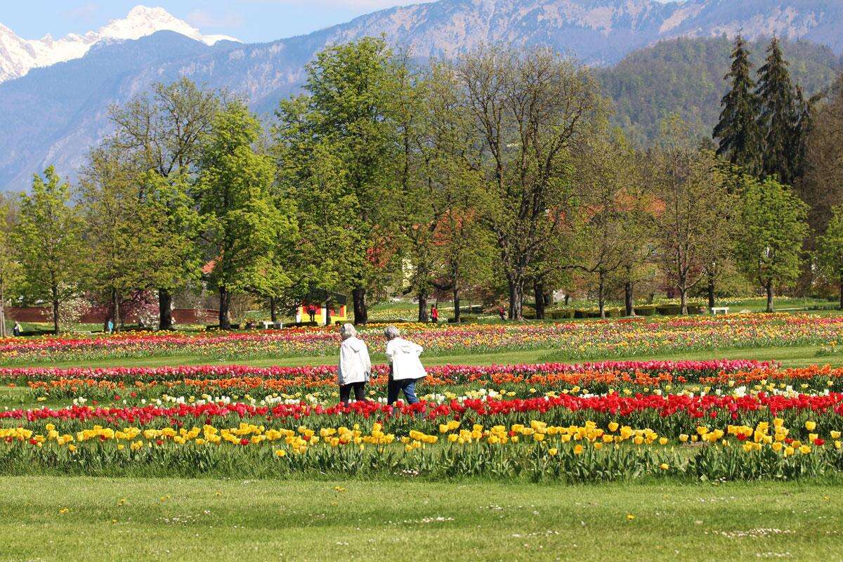 Utunk első állomása a Ljubljanától mindössze 20 km-re található Arborétum, ahol a tavaszi időszakban a híres holland Keukenhofhoz hasonlóan akár 2 millió tulipán is virágzik egyszerre. A bejárat után rögtön balra tekintve azonnal mesés látványban lesz részünk: a nyíló tulipánok mellett kanyargó ösvények, árnyékoló sátrak, üvegházak, és a távolban a gyönyörű havas hegyek, a Karavankák. A 85 hektáros területen a tulipánokon kívül 1000 rózsafajta, a télikertben kaktusz és orchideagyűjtemény majd 5000 fa várja a turistákat. Festői környezetben, patakok és tavak között, hegyekkel körbevéve sétálgathatunk a milliónyi virág között. a kicsiket játszótér is várja, de ajándékbolt, kávézó, kisvonat is hozzájárul a szórakozáshoz. Kissé távolabb szobrok, szépen nyírt gyep, formára vágott bokrok sora, és a távolban egy kis kastély… Aztán egyszer csak bálnák, majd a mozgó-morgó dinoszauruszok, különféle mesejelentek – pl. a Piroska és a farkas következik. Tovább haladva egy berendezett régi paraszt-házzal találkozhatunk, korabeli fa és vas szerszámokkal, körülötte fűszernövényes- és konyha-kertekkel.